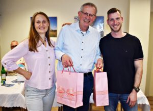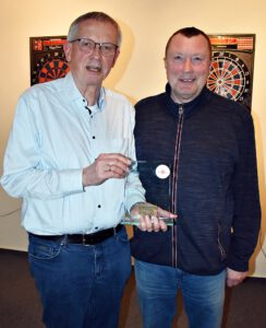 Die Dart-Gewinner Susanne Diesterweg und Sebastian Wulkow (r.) nahmen die Glückwünsche und kleine Preise vom TSV-Vorsitzenden Dietrich Klein entgegen.